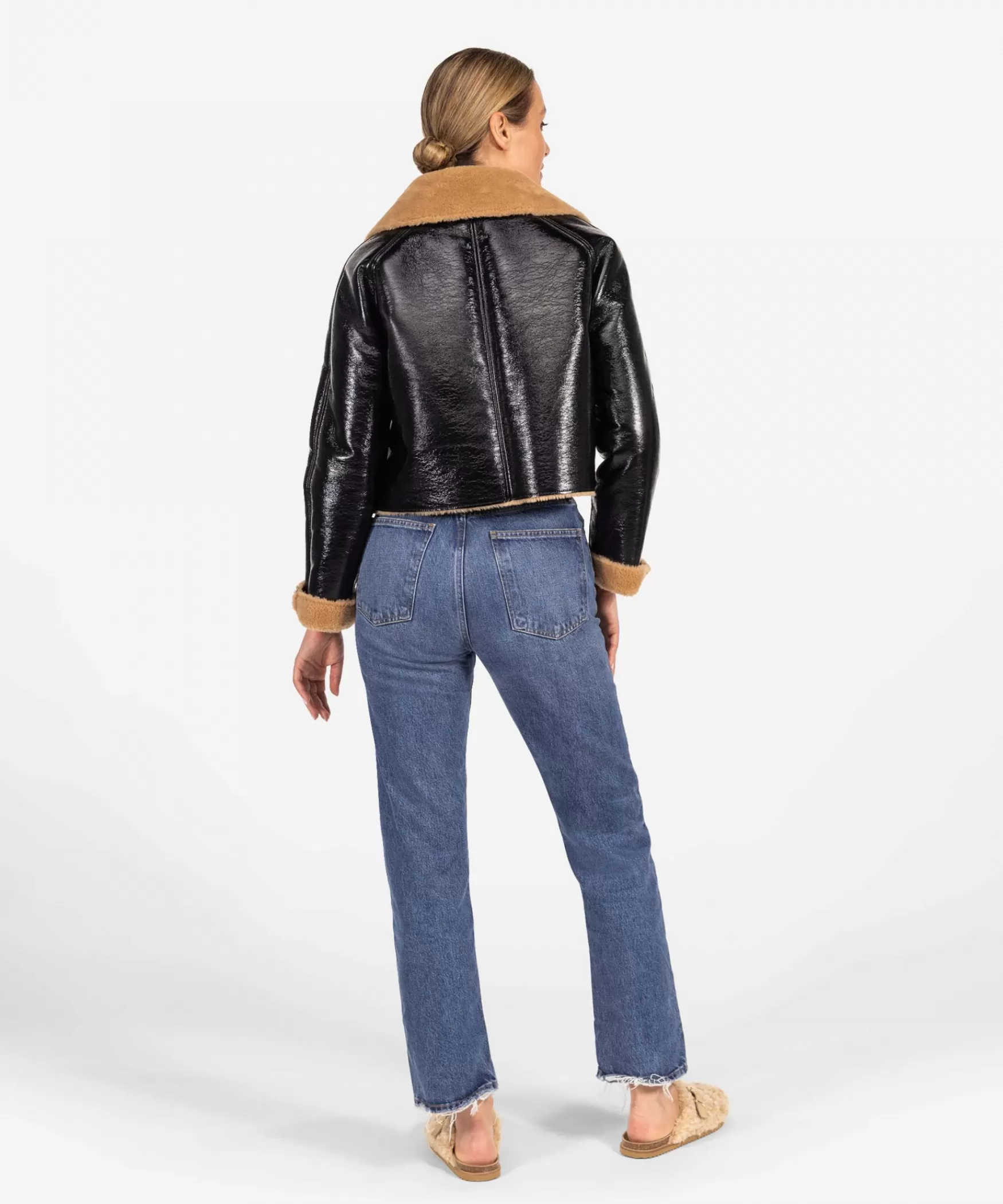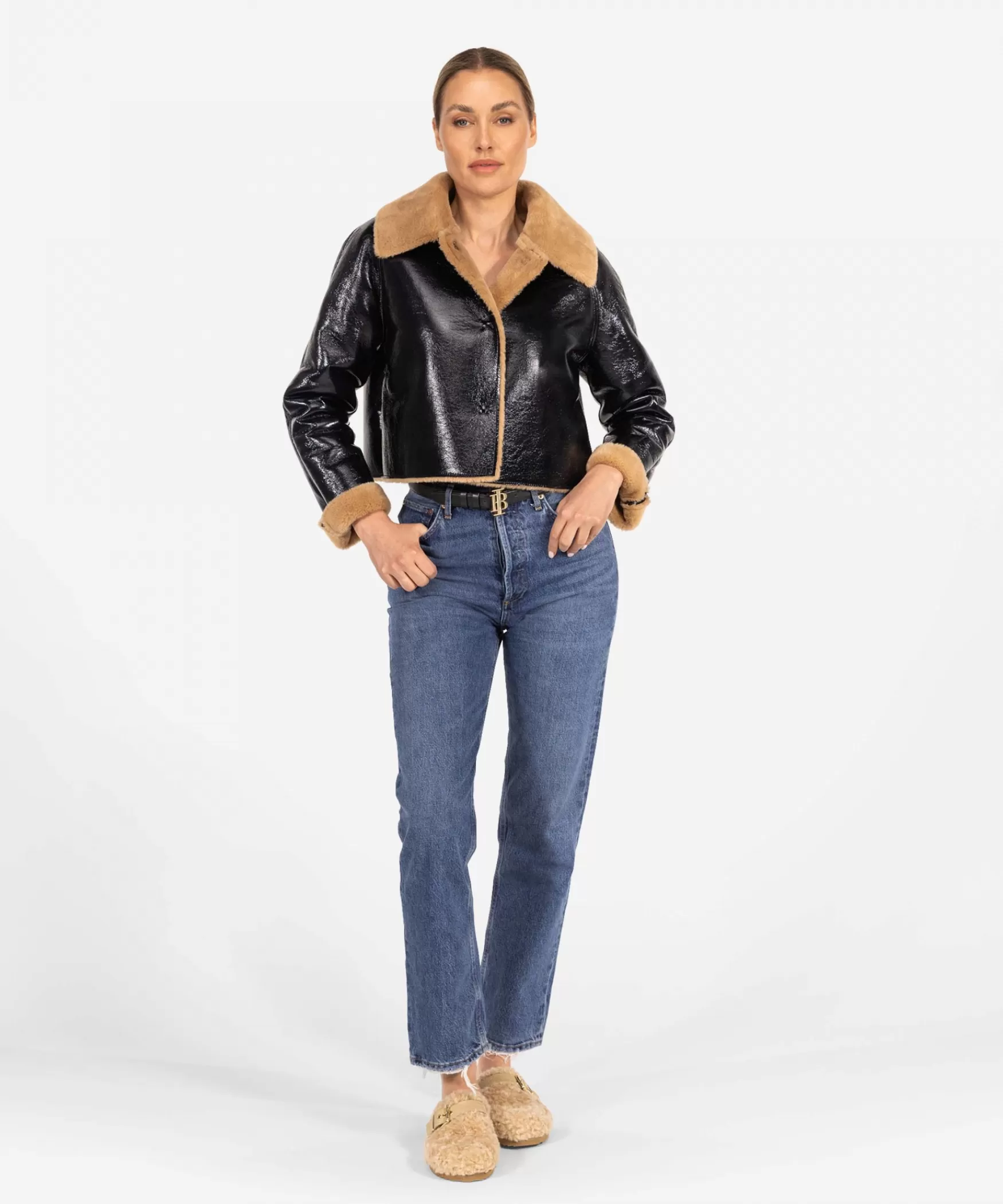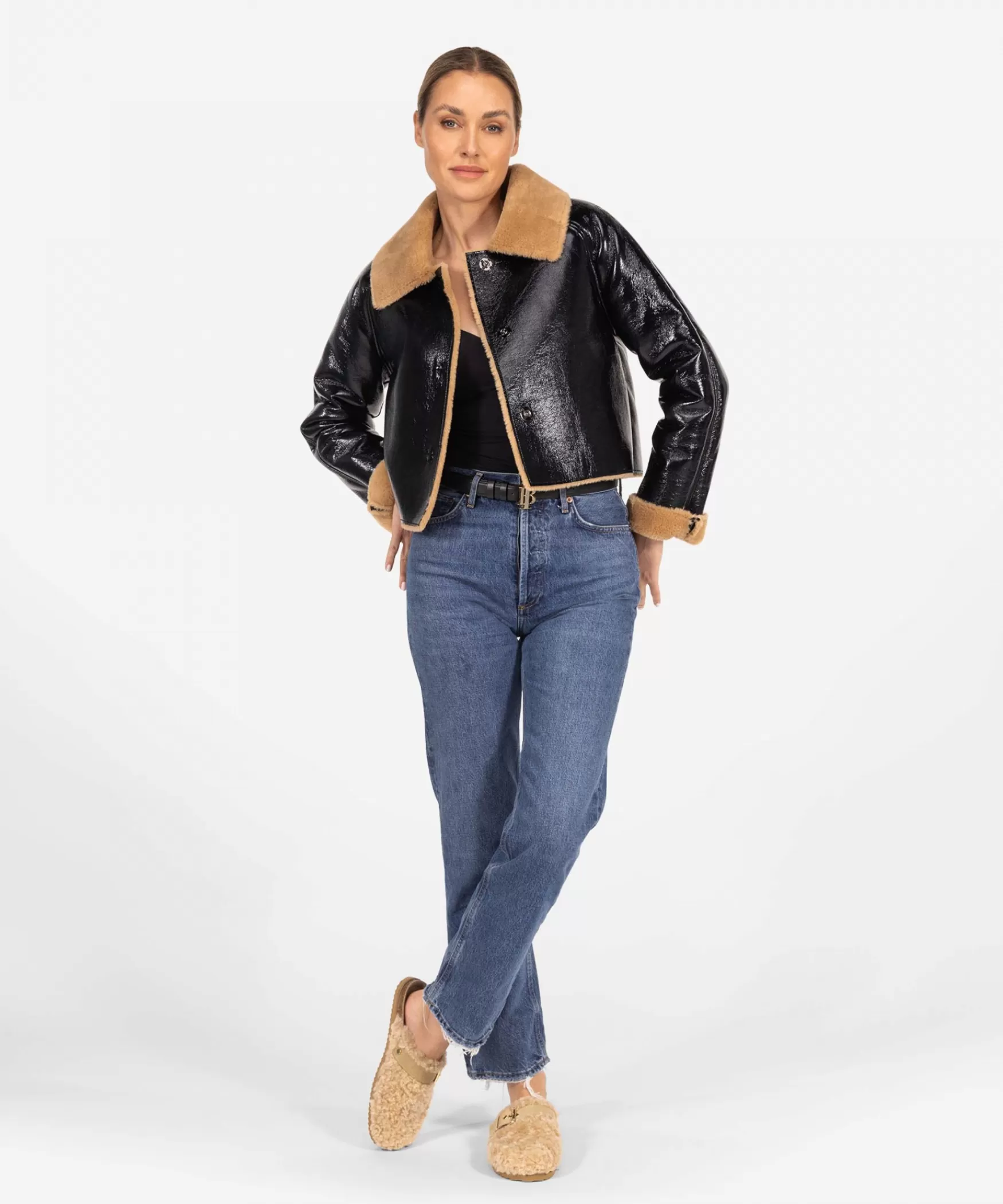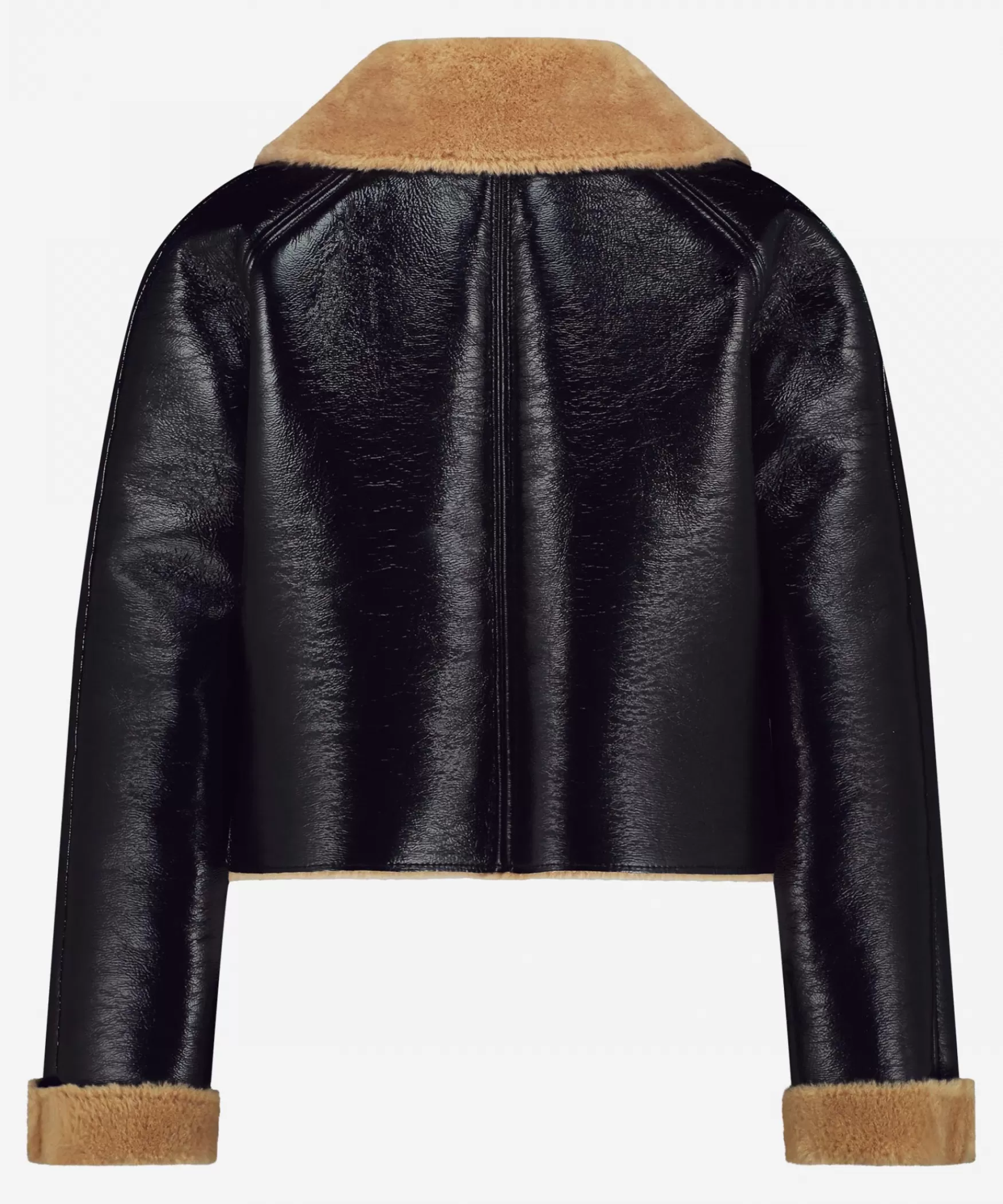 DE CARSON JAS IN BLACK|Dit is het cropped eye-catching Carson jasje in de kleur Black lak. Dit korte jasje heeft een fashionable look door de bijzondere coating aan de buitenkant en de contrasterende bruine faux fur kraag en omslag aan de armen. De jas sluit met drukknopen aan de voorkant, wat zorgt voor een stijlvolle afwerking. Op zoek naar een speciaal jasje voor de winter? Dan is de Carson zeker iets voor jou!