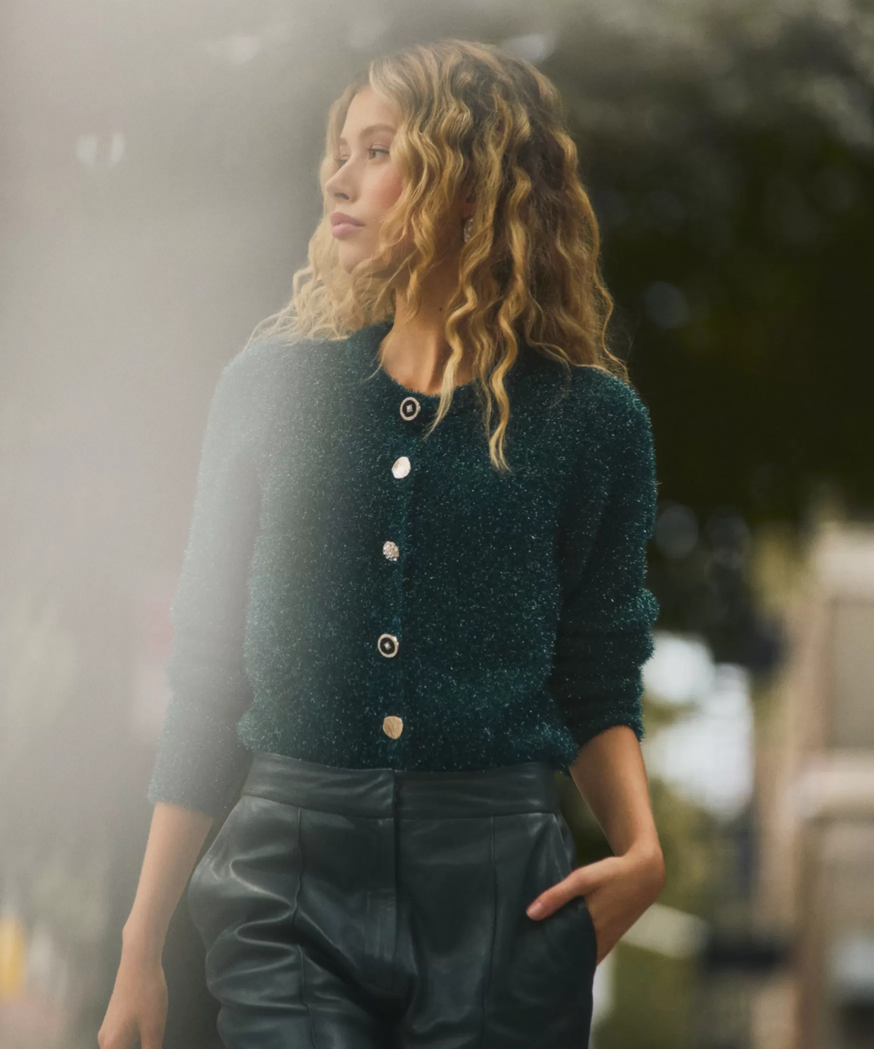 DE CHRISSY VEST IN DEEP TEALDit is het prachtige vest, de Chrissy, in de kleur Deep Teal. De Chrissy is gemaakt van een fijne, warme stof en heeft een ronde hals. Het unieke van de Chrissy is de glitter draad die erdoorheen wordt geweven en de verschillende opvallende knopen, die ook als sluiting dienen, waardoor je de cardigan zowel open als gesloten kunt dragen. Stylingtip: draag de Chrissy op de Peggy non-stretch leren broek voor een prachtige ton sur ton look.