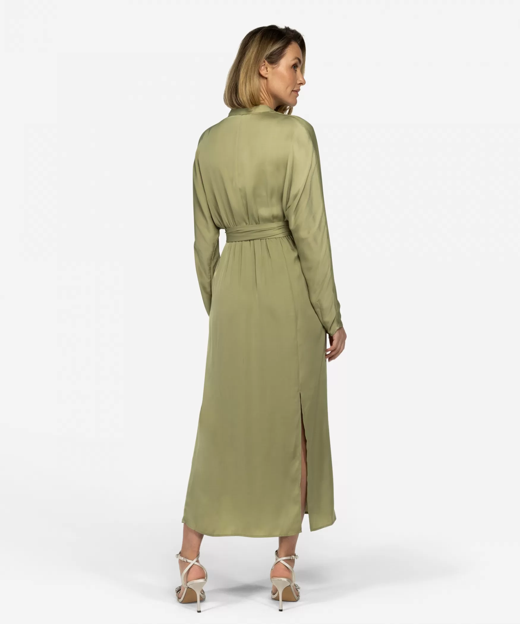 De Frida midi-jurk in Moss Green|De perfecte midi-jurk voor een speciale gelegenheid is onze Frida jurk in de kleur Moss Green. De jurk is vervaardigd uit een soepele polyester stof, waardoor deze luchtig en comfortabel aanvoelt. Met een ronde hals en blinde knoopsluiting kun je zelf bepalen of je de jurk gesloten of met een V-hals draagt. De taille wordt geaccentueerd door het elastiek dat aan de binnenkant is bevestigd. Aan de zijkanten bevinden zich twee zijzakken. De onderkant heeft een overslageffect en aan de achterkant is een kleine split aangebracht. Stijltip: maak de look compleet met hakken en het Avril tasje.