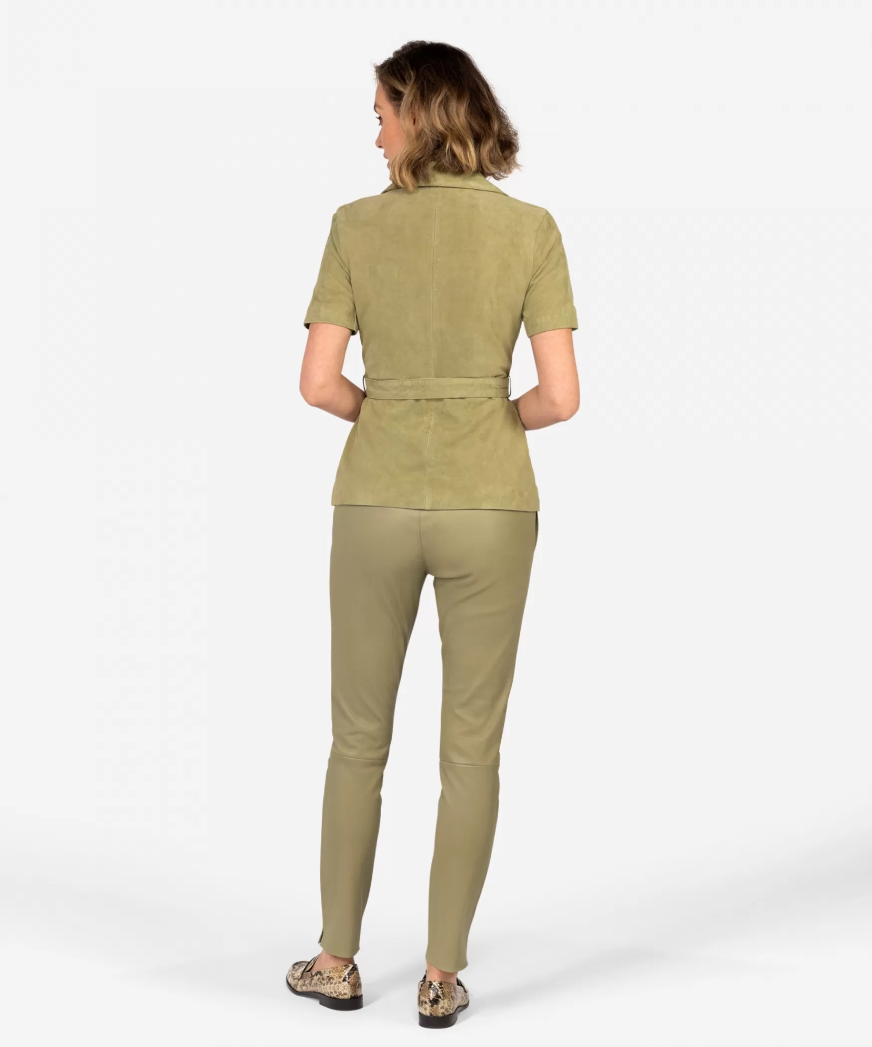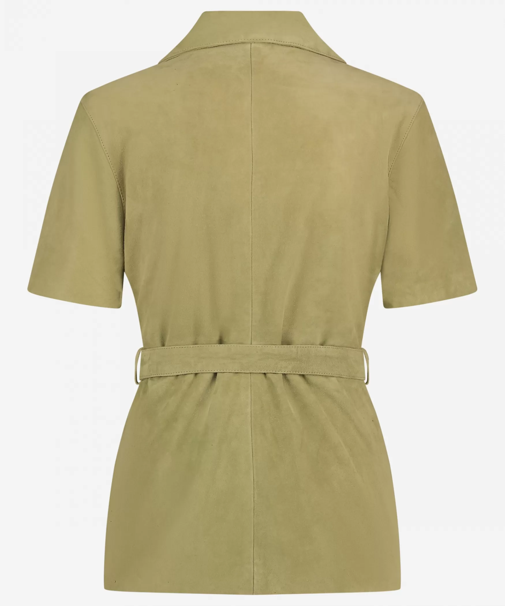 DE SUEDE JESSY JAS IN MOSS GREEN|Maak kennis met onze suede Jazzy jacket in de kleur Moss Green. De jas is aan de buitenkant gemaakt van suede en aan de binnenkant dun gevoerd. De jas heeft een getailleerde pasvorm, mede dankzij de bijpassende tailleband. Verder heeft de jas een reverskraag, vier klepzakken en sluit door middel van knopen. De jas kan naar keuze open of gesloten gedragen worden en op verschillende manieren gestyled worden. Voor een casual look kan je de jas met een broek en loafers dragen, voor een meer geklede look draag je er hakken onder.