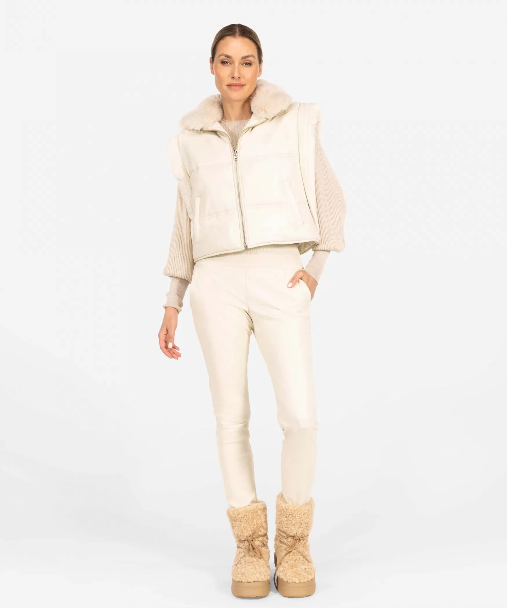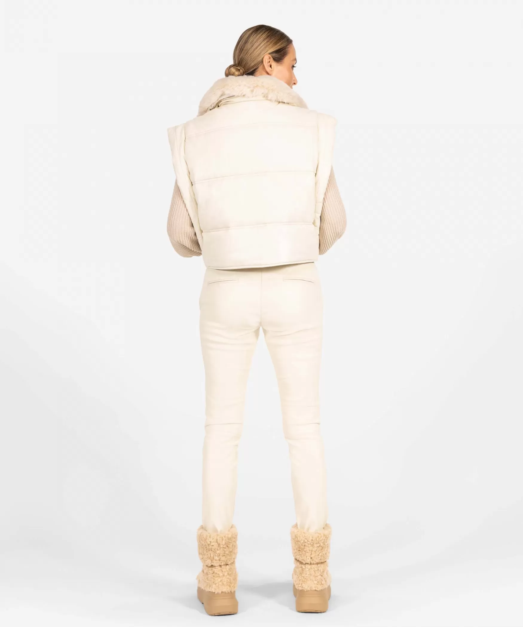 DE JOELLE BODYWARMER IN COCO WHITE|Deze hoogwaardige kwaliteitsleren Joelle bodywarmer in de kleur Coco White is dit seizoen onmisbaar in jouw garderobe. De bodywarmer heeft bredere schouders wat zorgt voor een krachtige en vrouwelijke uitstraling. Aan de voorkant bevinden zich twee steekzakken. De faux fur kraag maakt de bodywarmer af, maar ben je minder fan van de kraag? Goed nieuws! De faux fur kraag kan van het gilet afgeknoopt worden. Het model op de foto combineert de Joelle met de lurex Totie top samen met de all-time-favourite Colette broek in de kleur Coco White. We love this ton-sur-ton look!