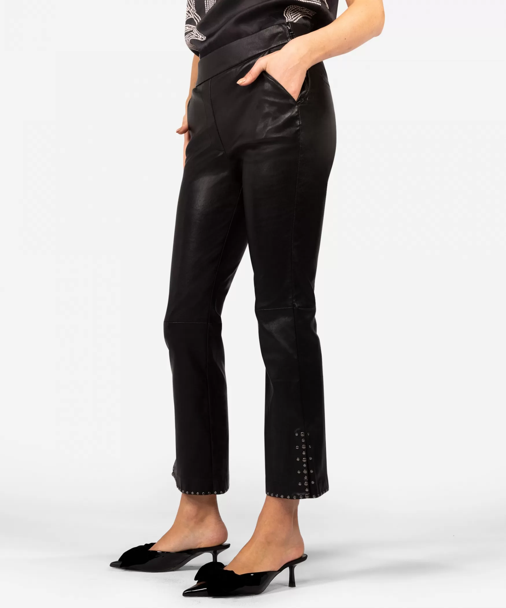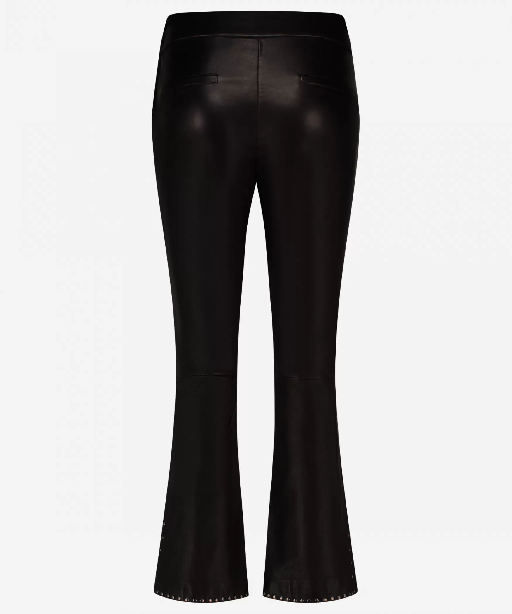 DE PAGLA BROEK IN HET ZWART|Maak kennis met onze Pagla flared broek. De broek is gemaakt van stretchleer en heeft een mid-waisted fit. Een leuk detail aan de broek zijn de kleine zilveren studs aan de onderkant van de pijpen. Deze broek is leuk te combineren met de Tanina top en hakken.