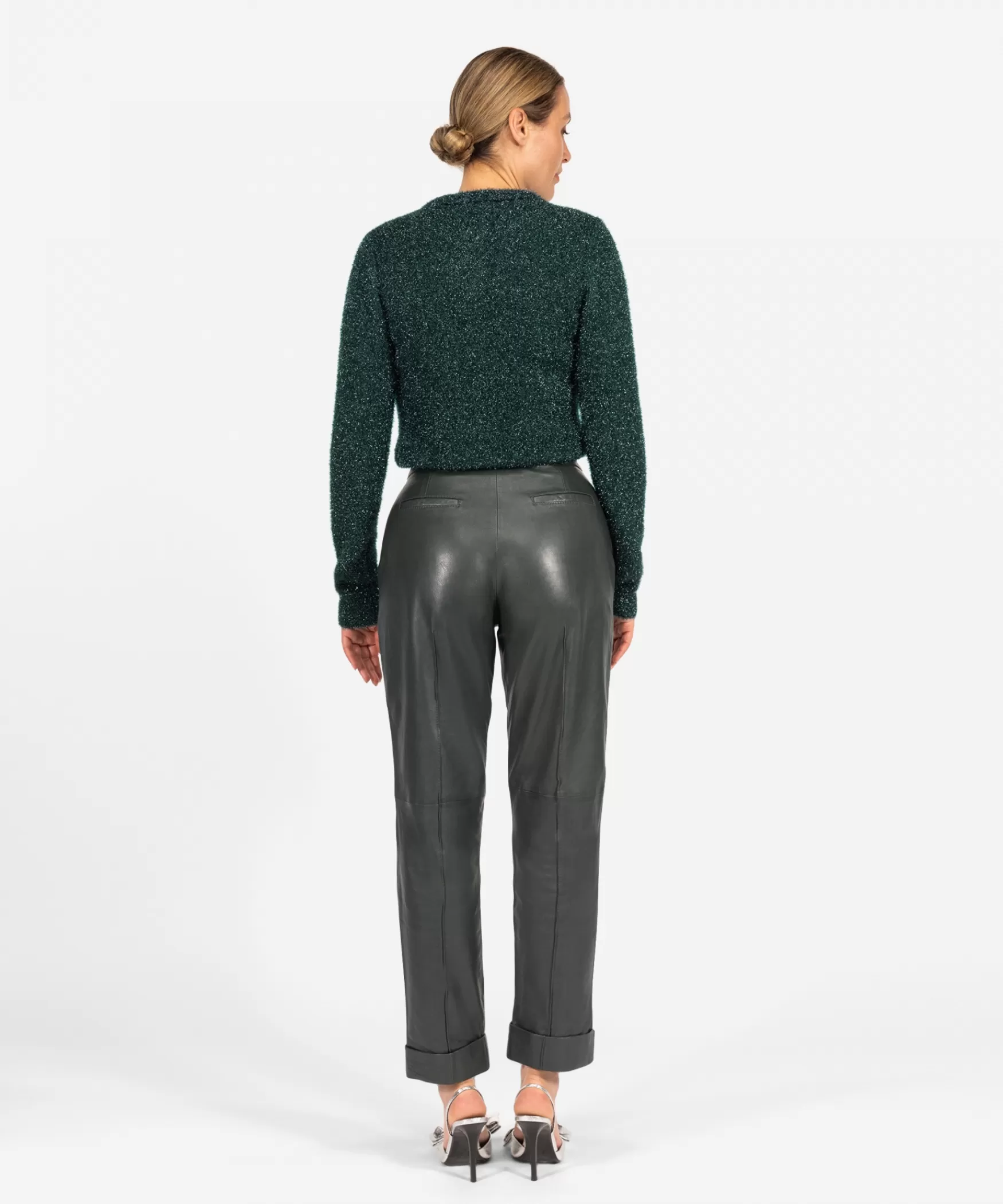 DE PEGGY BROEK IN DEEP TEAL|Maak kennis met onze Peggy broek in de donkere warme kleur Deep Teal. Deze mid-waist broek heeft wijdere broekspijpen en is gemaakt van hoogwaardig leer, met omgeslagen broekspijpen als stijlvol detail. De broek bevat twee handige steekzakken en sluit met een rits en hook and eye sluiting. Voor een complete en elegante look combineer je de Peggy broek met de Chrissy knit in Deep Teal zoals het model op de foto. Deze combinatie zorgt voor een samenhangende en trendy outfit, perfect voor verschillende gelegenheid.
