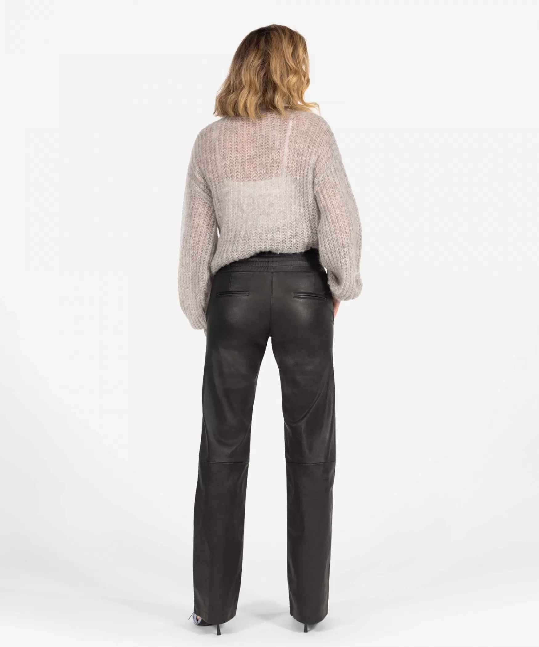DE PHIBBY BROEK IN BLACK|Dit is de Phibby, onze wide leg leren stretch broek in de kleur zwart. Met een wide leg en een high waist taille biedt deze pantalon niet alleen een mooie look maar ook draagcomfort. De zwarte leren broek is voorzien van een brede elastieke band en heeft twee steekzakken aan de voorzijde en paspelzakken aan de achterzijde. Combineer zoals het model de Phibby broek met de grijze Tobyn trui.