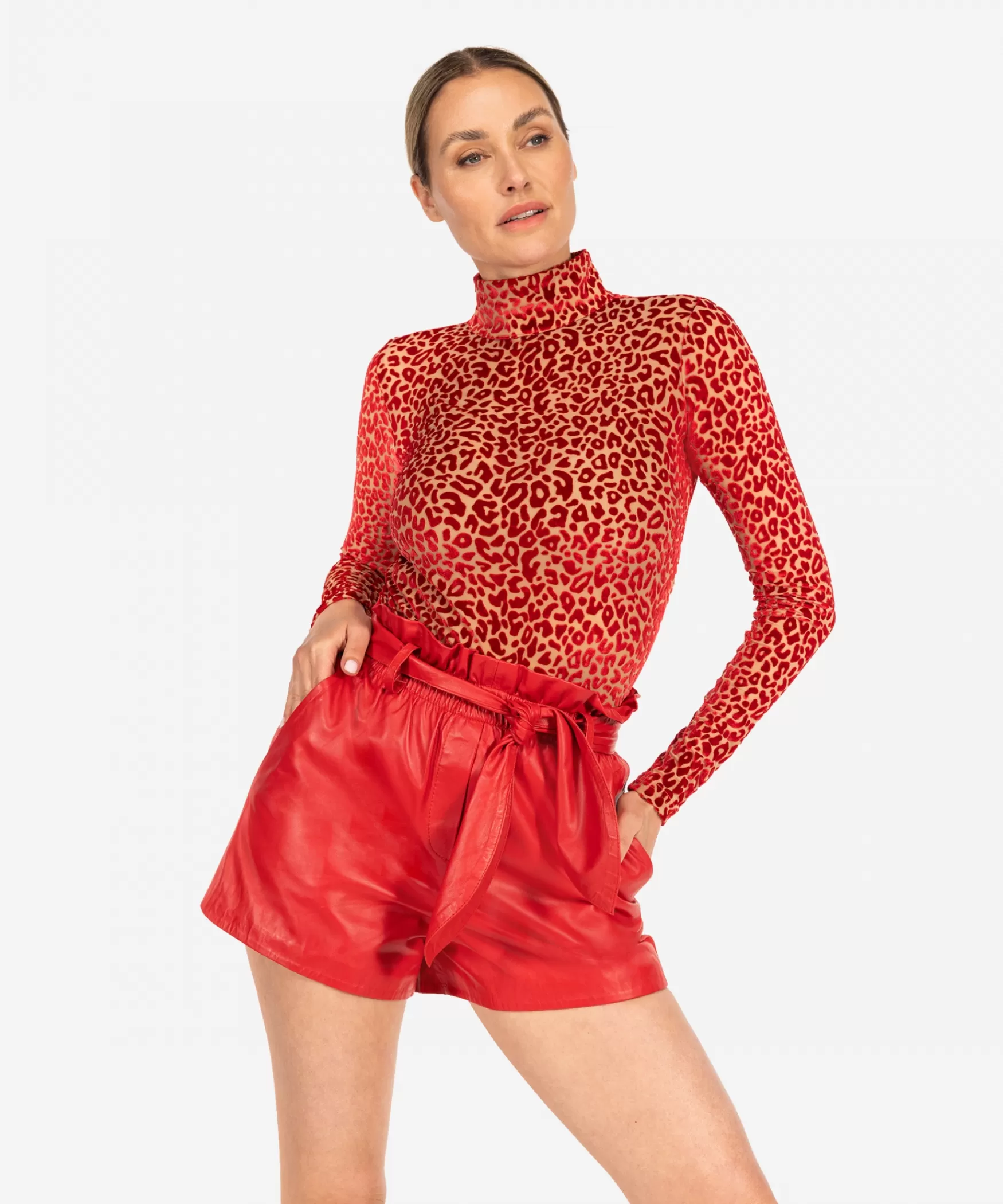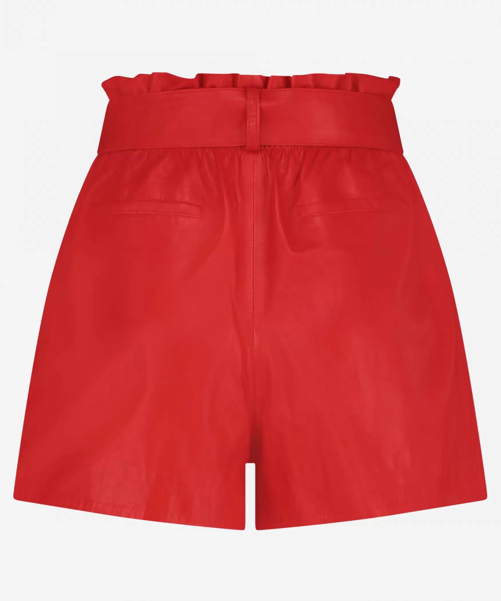 DE SASHA SHORTS IN RED BOMB|Maak kennis met de Sasha shorts in de te gekke kleur Red Bomb. Een eye-catching leren shorts gemaakt van hoogwaardige leer kwaliteit. De Sasha heeft een high-waisted fit met bovenaan een elastieke tailleband. Hallo comfortabele fit! Bij de shorts zit een bijpassend ceintuur en je kan ervoor kiezen om de shorts met of zonder ceintuur te dragen. Het model op de foto draagt de Sasha samen met de geprinte Telana top. Ook is de shorts goed te combineren met onze all-time favourite Emma blouse of Tony knit. Maak je klaar voor een fashionable seizoen!