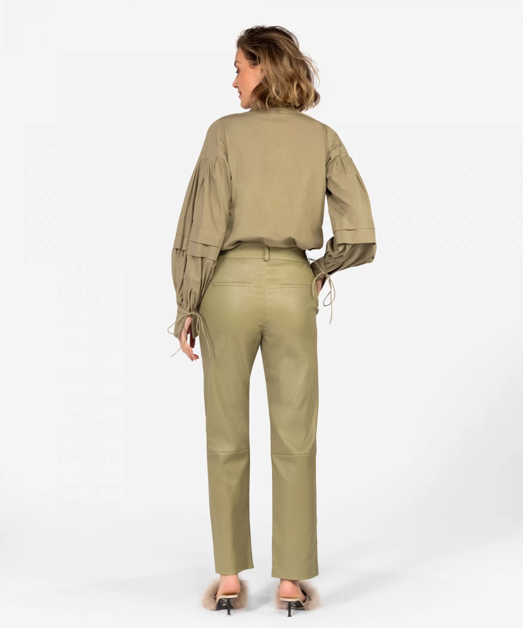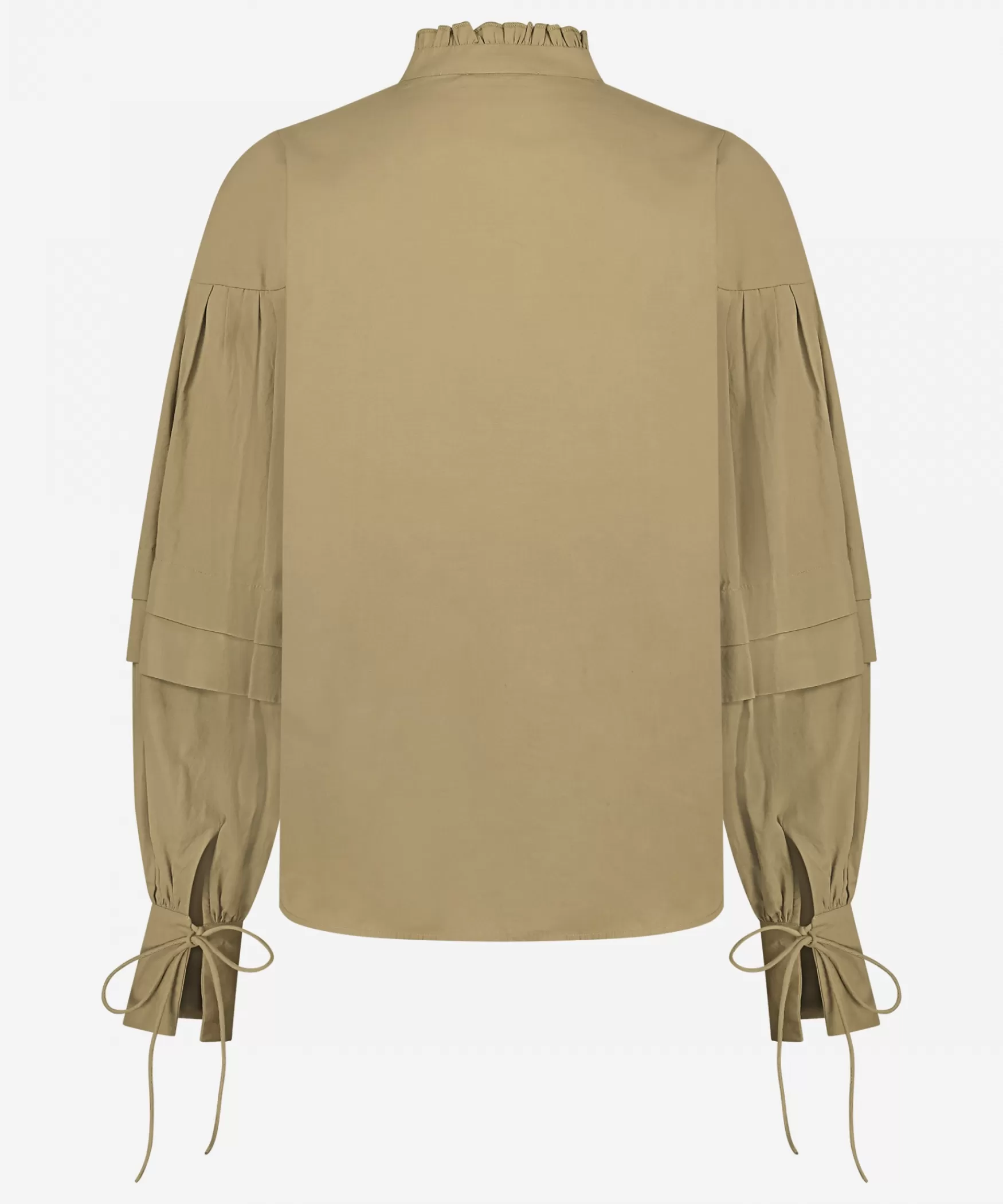 DE TASH TOP IN MOSS GREEN|Maak dit seizoen kennis met de Tash top in de kleur Moss Green. De top is gemaakt van katoen en heeft een wijde pasvorm. Verschillende details maken deze top allesbehalve basic. De lange mouwen hebben plooien en manchetten met koordjes, waardoor de mouwen een volumineus effect krijgen. De hals heeft een boordje met plooien als detail. Met de koordjes kan de top gesloten worden of met een V-hals gedragen worden. Combineer deze top met een bijpassende Paudine broek in dezelfde kleur.