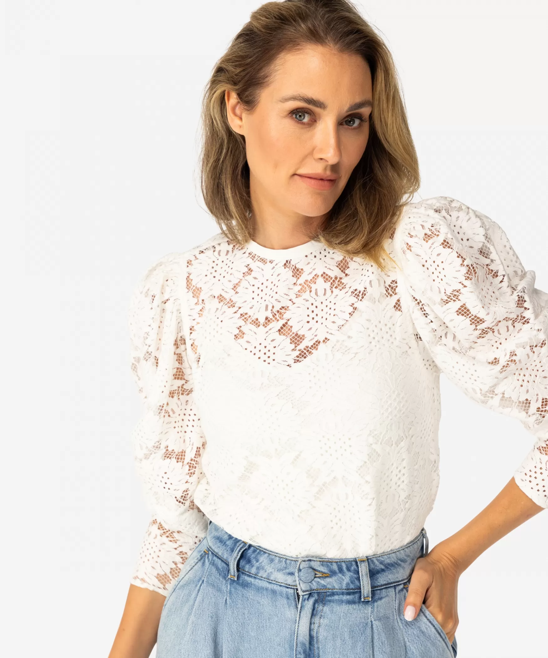 TILIA TOP IN WHITEMaak kennis met de Tilia Top in de kleur White. Deze kanten top met bloemenprint is gemaakt van hoogwaardige embroderie kwaliteit, heeft een lichte pofmouw en kan aan de achterkant gesloten worden met een knoopje. Bij de Tilia top zit een bijpassend onderhempje in dezelfde kleur. Je kunt deze kanten top prachtige combineren met jouw favoriete (lichte) jeans.