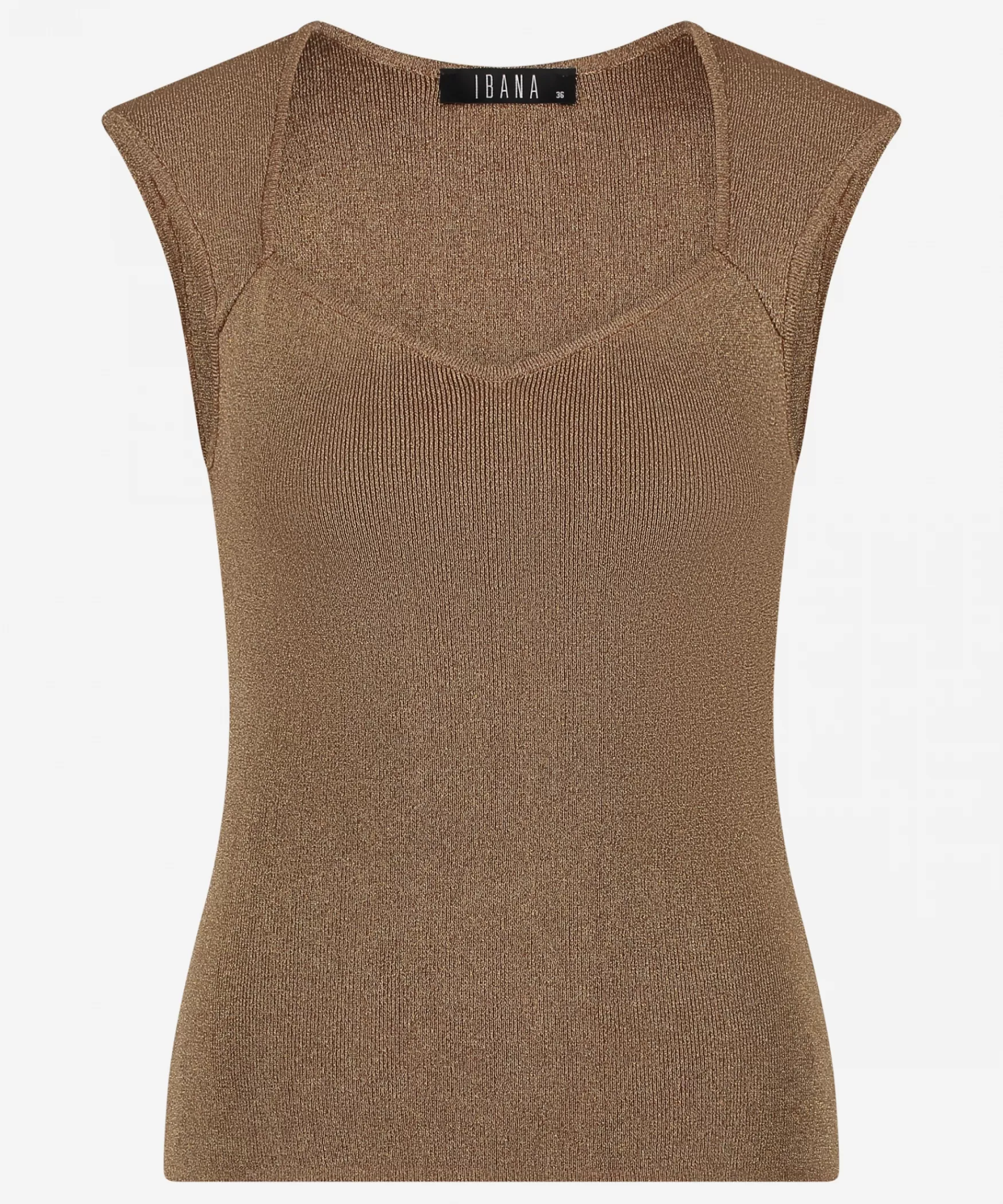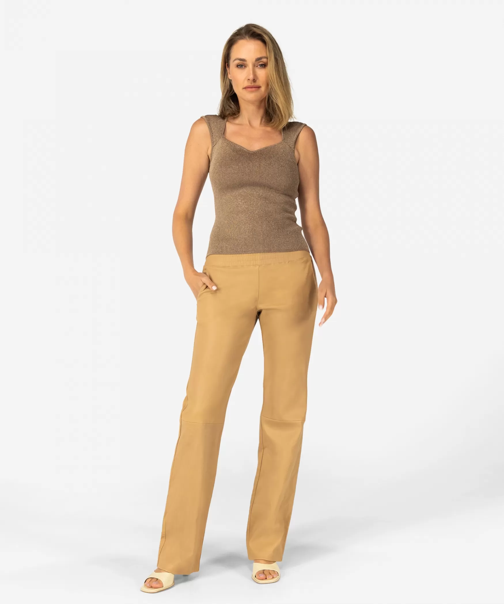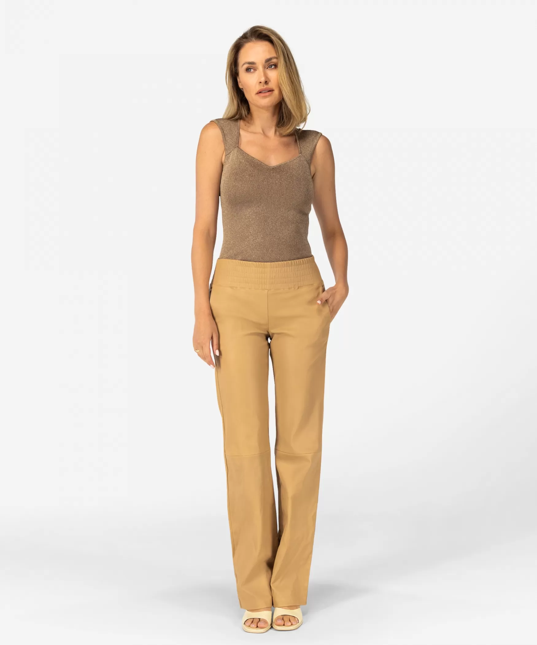 DE TRELLA TOP IN HAZELNUT|De Trella top is ook dit seizoen weer terug in de collectie. Dit keer in de trendkleur Hazelnut. Een perfect basis topje met een lichte gouden glitter erin verwerkt. De hartvormige hals maakt de top net wat specialer en doordat de top gemaakt is van stretch materiaal zit de top mooi aangesloten en comfortabel. Stylingtip: het model op de foto draagt de Trella samen met de leren Phibby Pants in de kleur Sandalwood.