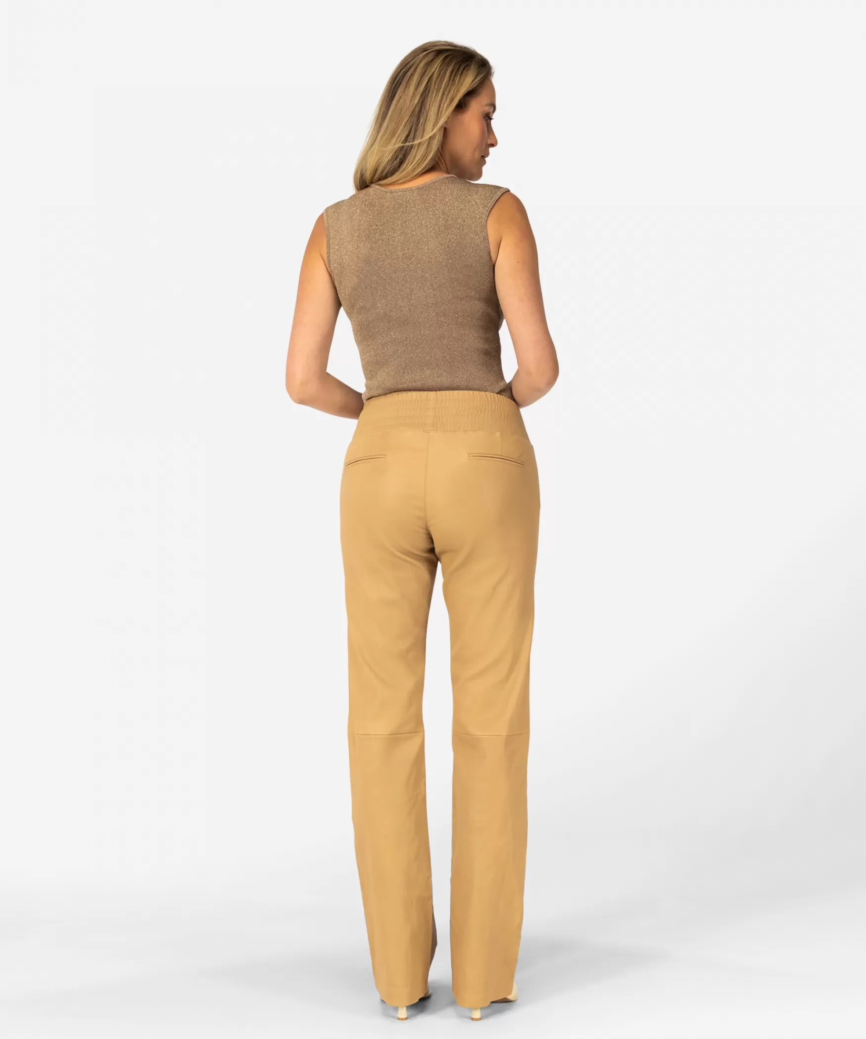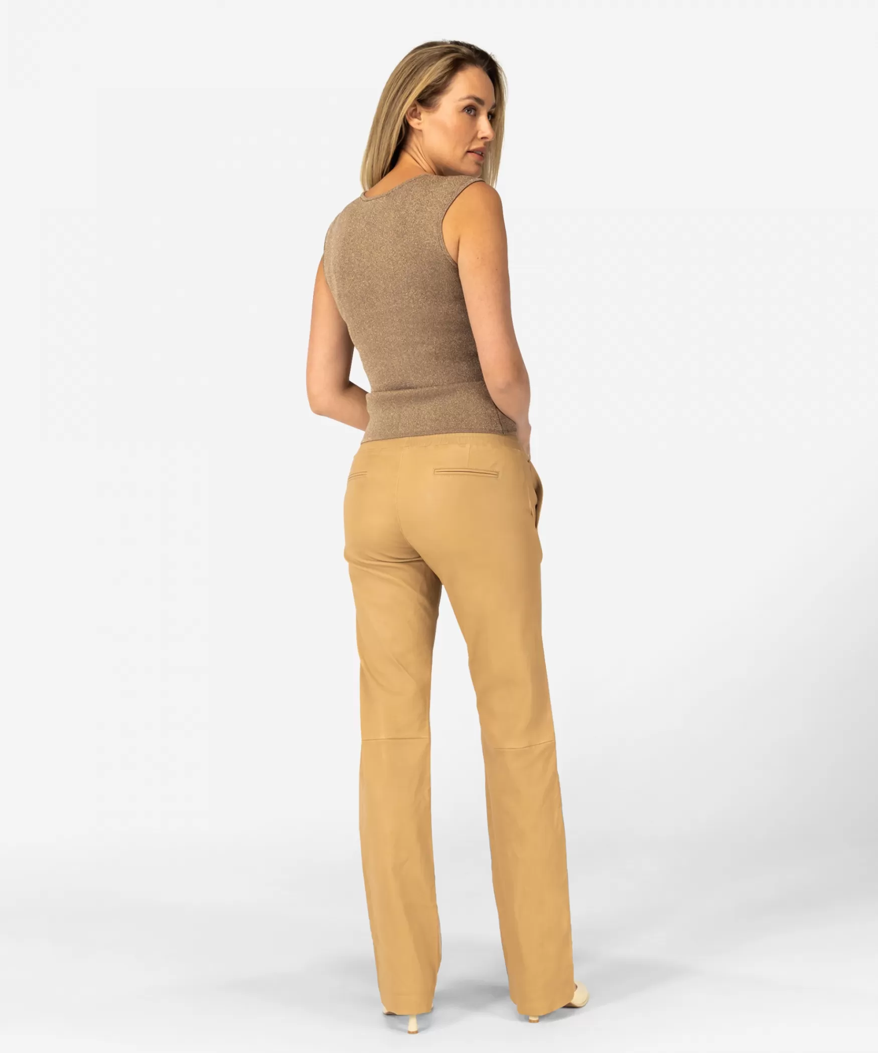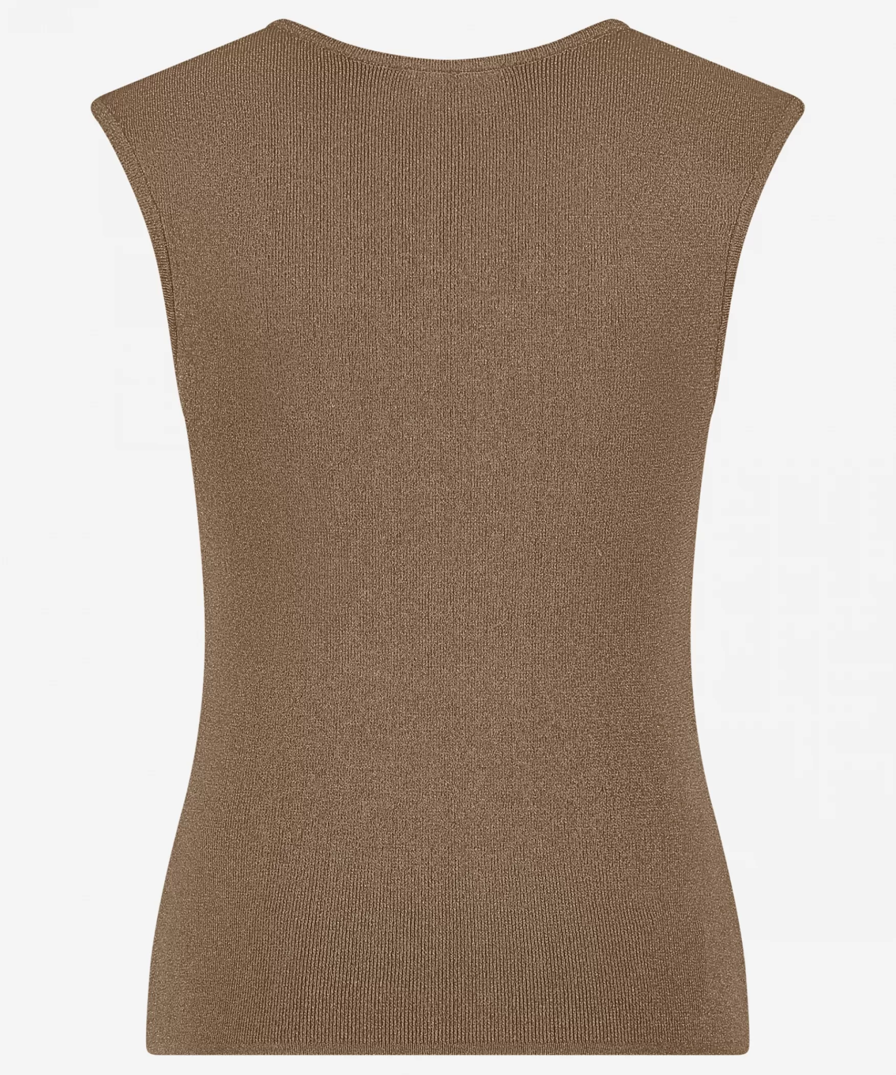 DE TRELLA TOP IN HAZELNUT|De Trella top is ook dit seizoen weer terug in de collectie. Dit keer in de trendkleur Hazelnut. Een perfect basis topje met een lichte gouden glitter erin verwerkt. De hartvormige hals maakt de top net wat specialer en doordat de top gemaakt is van stretch materiaal zit de top mooi aangesloten en comfortabel. Stylingtip: het model op de foto draagt de Trella samen met de leren Phibby Pants in de kleur Sandalwood.
