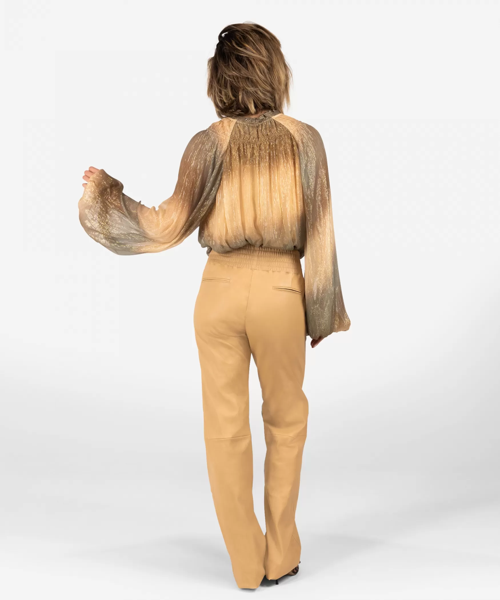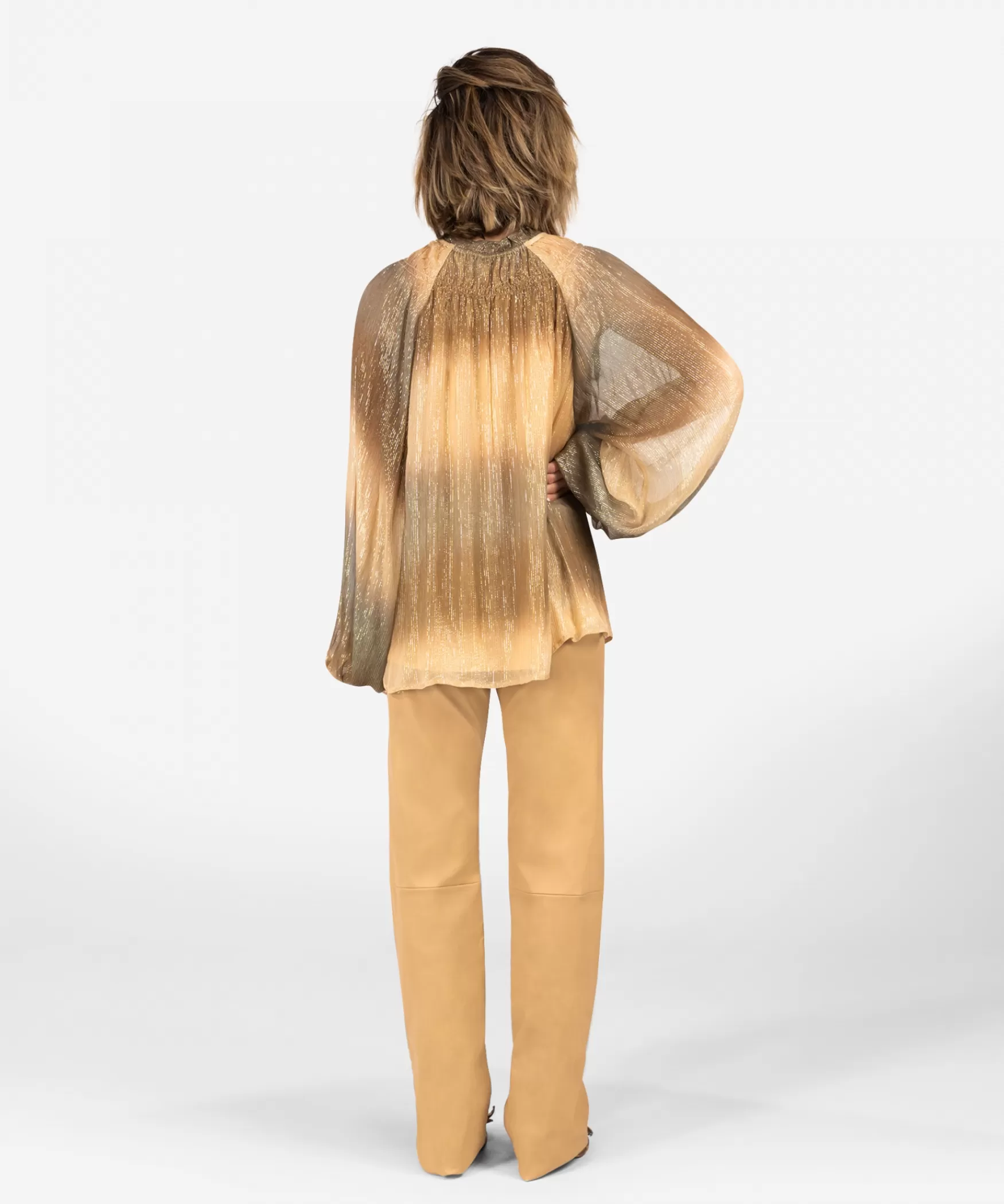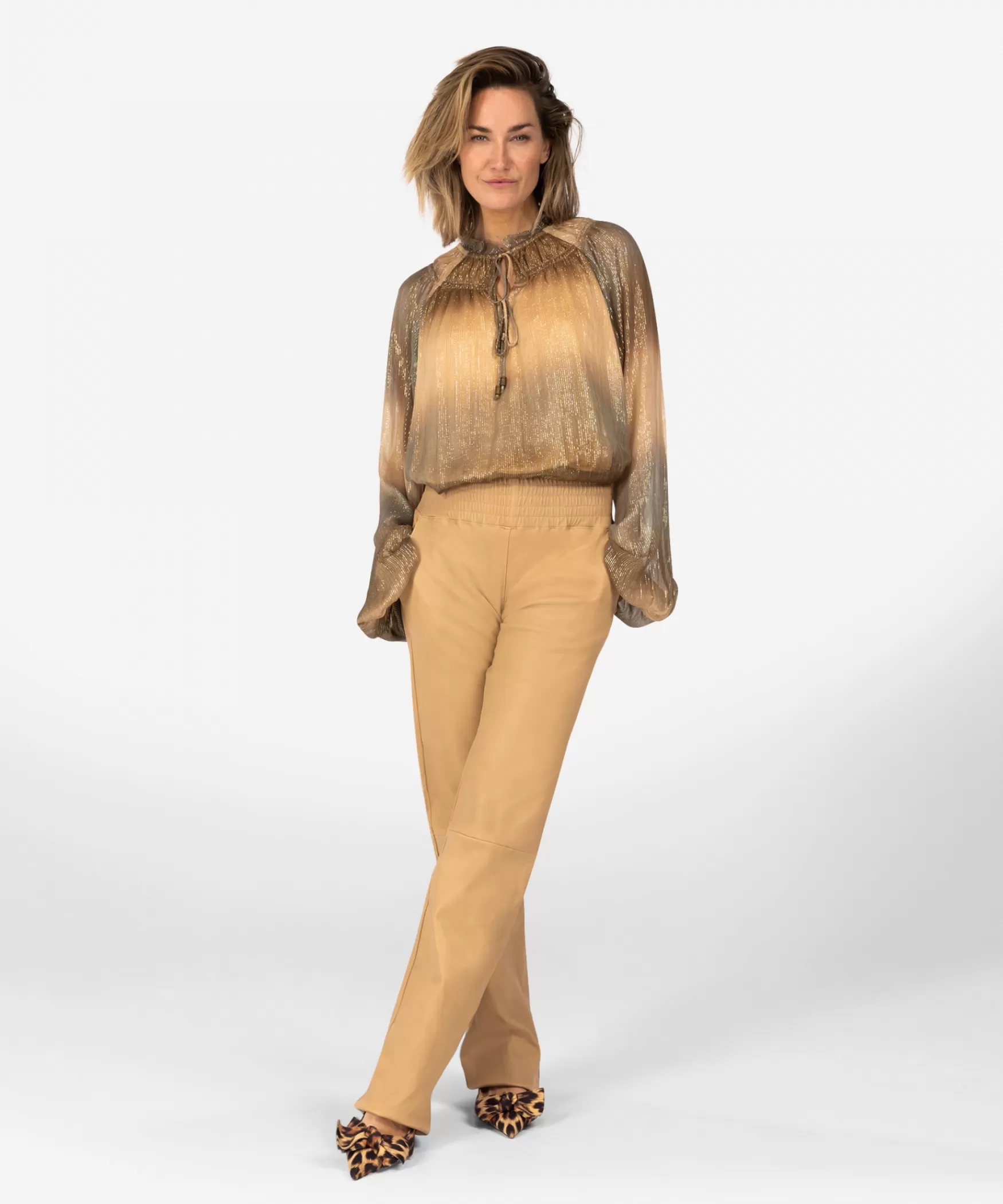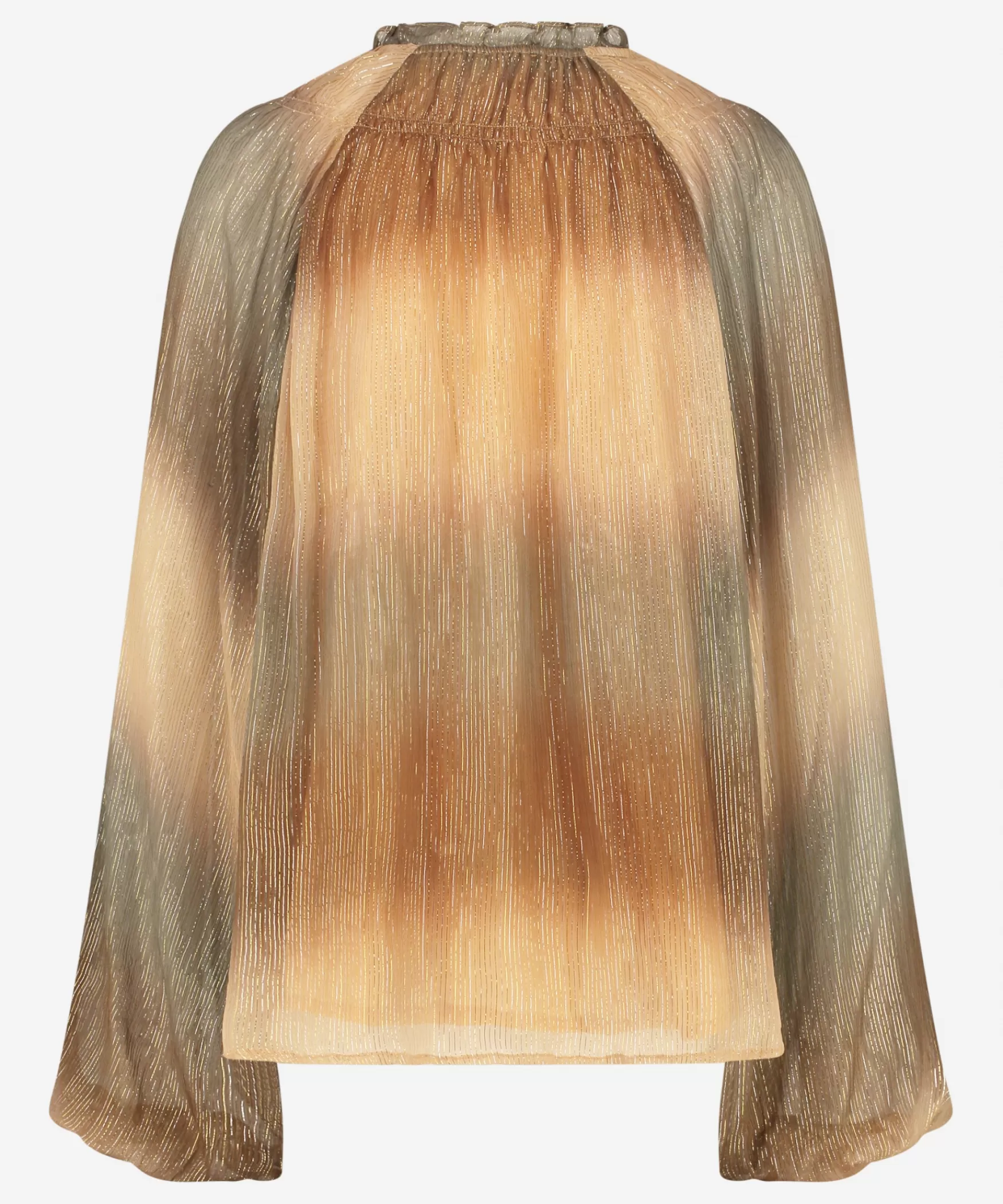 DE TYVA TOP IN NEUTRAL DIPDYE|De Tyva top in Neutral Dipdye print is dé top voor deze herfst. De prachtige ombre print van zacht geel, bruin en groen is wat deze top zo bijzonder maakt. De Tyva top is gemaakt van viscose met gouden lurex draad en schittert prachtig door de lurex draad. Combineer de Tyva top met je favoriete jeans of combineer net als het model op de foto de top met de leren Phibby broek.